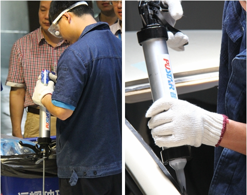 公司技術(shù)工程師就“汽車玻璃粘膠使用及注意事項”課程作了專業(yè)的講解,并引導(dǎo)學(xué)員進(jìn)行了現(xiàn)場的實(shí)際操作。