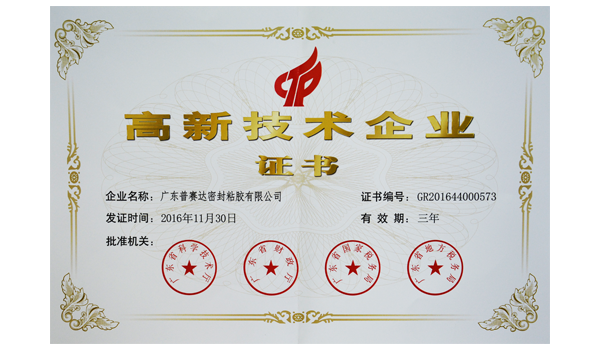 近日,公布了《2016年國(guó)家高新技術(shù)企業(yè)復(fù)審結(jié)果》,廣東普賽達(dá)密封粘膠有限公司榜上有名,標(biāo)志著公司順利通過(guò)高新復(fù)審,再次被認(rèn)定為高新技術(shù)企業(yè),現(xiàn)已頒發(fā)證書(shū)。(證書(shū)編號(hào):GR201644000573)