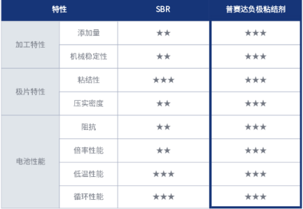 針對負極材料的特性,惠州普賽達研發(fā)的負極粘結(jié)劑是丙烯酸酯共聚物乳液,有著40%固含和適當?shù)漠a(chǎn)品粘度,其優(yōu)異的粘結(jié)性能使其添加量優(yōu)于日本最高技術(shù)水平的SBR產(chǎn)品;具有優(yōu)異的加工性能,穩(wěn)定性好,且高速攪拌不易破乳;惠州普賽達負極粘結(jié)劑可針對客戶應(yīng)用場景,在合成共聚物中引入功能團,調(diào)整粘結(jié)劑Tg,改善低溫性能