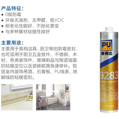 主要用于高檔潔具、廚衛(wèi)等的防霉密封。也可適用于廚衛(wèi)五金掛件、不銹鋼、木材、各類裝飾件、玻璃制品與陶瓷墻面的粘接定位以及瓷磚脫落快速修補(bǔ)。包括室內(nèi)裝飾吊頂、石膏板、PU 線條、地腳線的粘接密封。可適用于鋁合金門窗邊室內(nèi)部位的密封防水;金屬、鍍鋅板、不銹鋼、鈑金等材料的粘接密封。