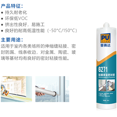 6271 為單組分濕氣固化密封膠,采用中性硅酮膠作為原料, 對環(huán)境無污染,與金屬、陶瓷、玻璃、石材等多種基材具有良好的密封粘接性能。