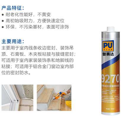 主要用于室內(nèi)線條收邊密封、裝飾吊頂、石膏板、木夾板粘接與接縫密封;可適用于室內(nèi)家裝裝飾條和地腳線的粘接;可適用于鋁合金門窗邊室內(nèi)部位的密封防水。